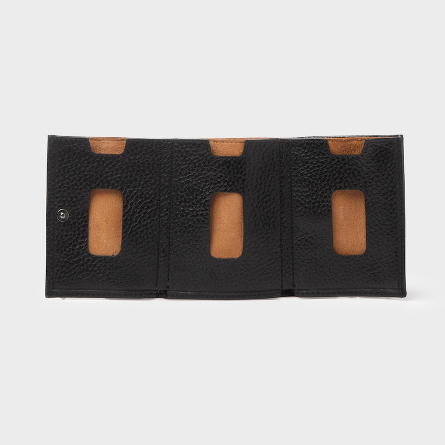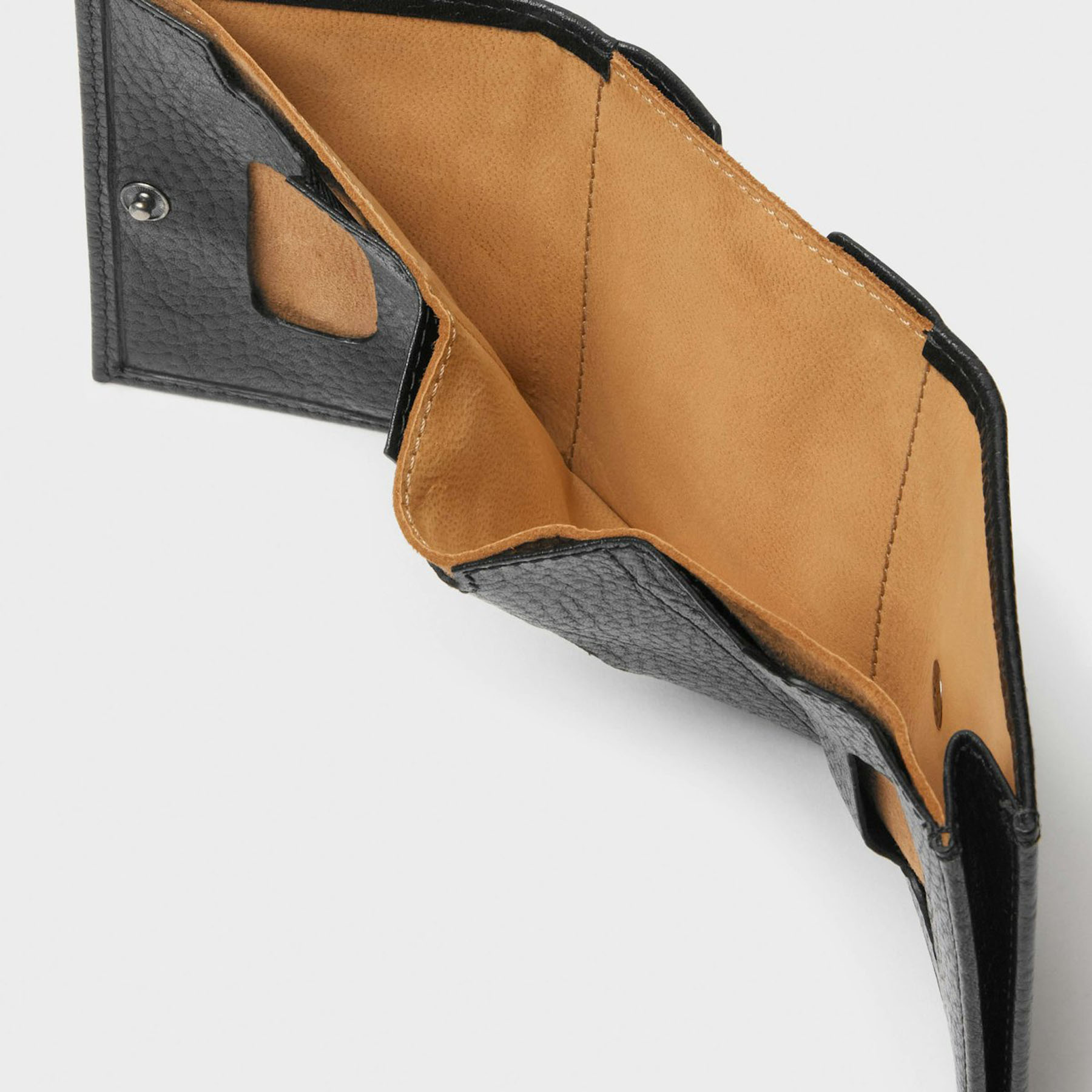 Pung Warga fra Saddler. Tidløs pung i fuldnarvet læder, eksklusivt foret med et blødt gedeskind. Warga er en fleksibel pung med en rummelig opbevaring, udstyret med et seddelrum og tre lommer til kort på indersiden og et på ydersiden. Pungen er udstyret med en beskyttende RFID-membran og lukkes med en trykknap, der kan varieres mellem to trin. Pungen fungerer godt som et supplement til en kortholder