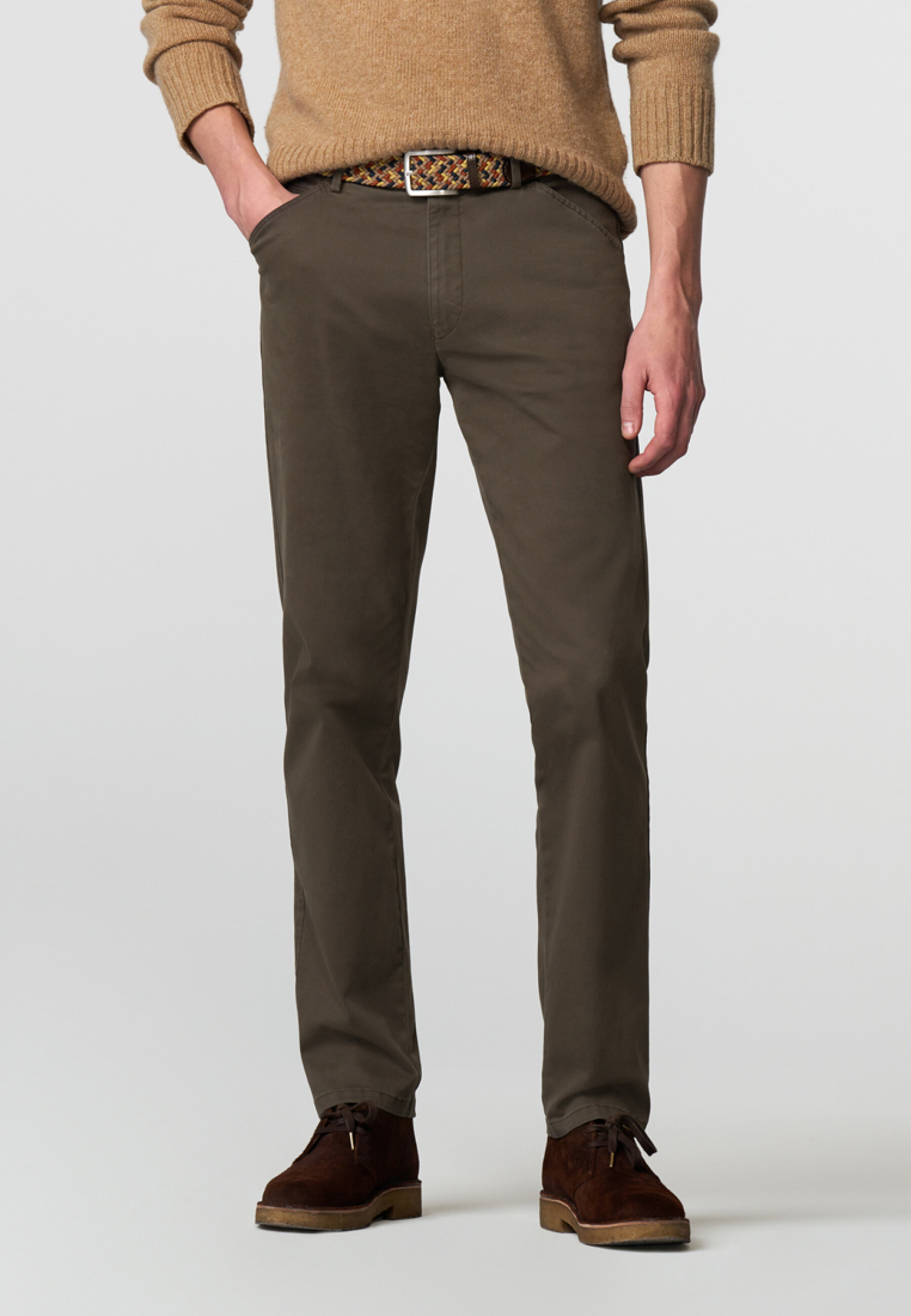 Chino i model Chigaco der har diagonal lommer fra Meyer i ny flot dark sand farve.