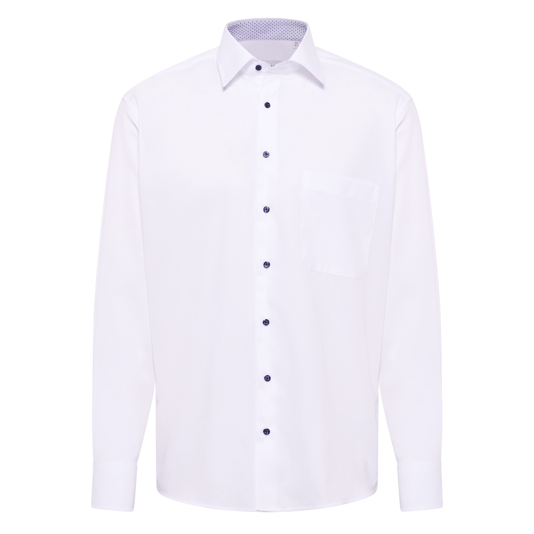 Comfort fit skjorte i hvid med kontrast i flip og manchet. Eterna skjorte med brystlomme i strygefri kvalitet
