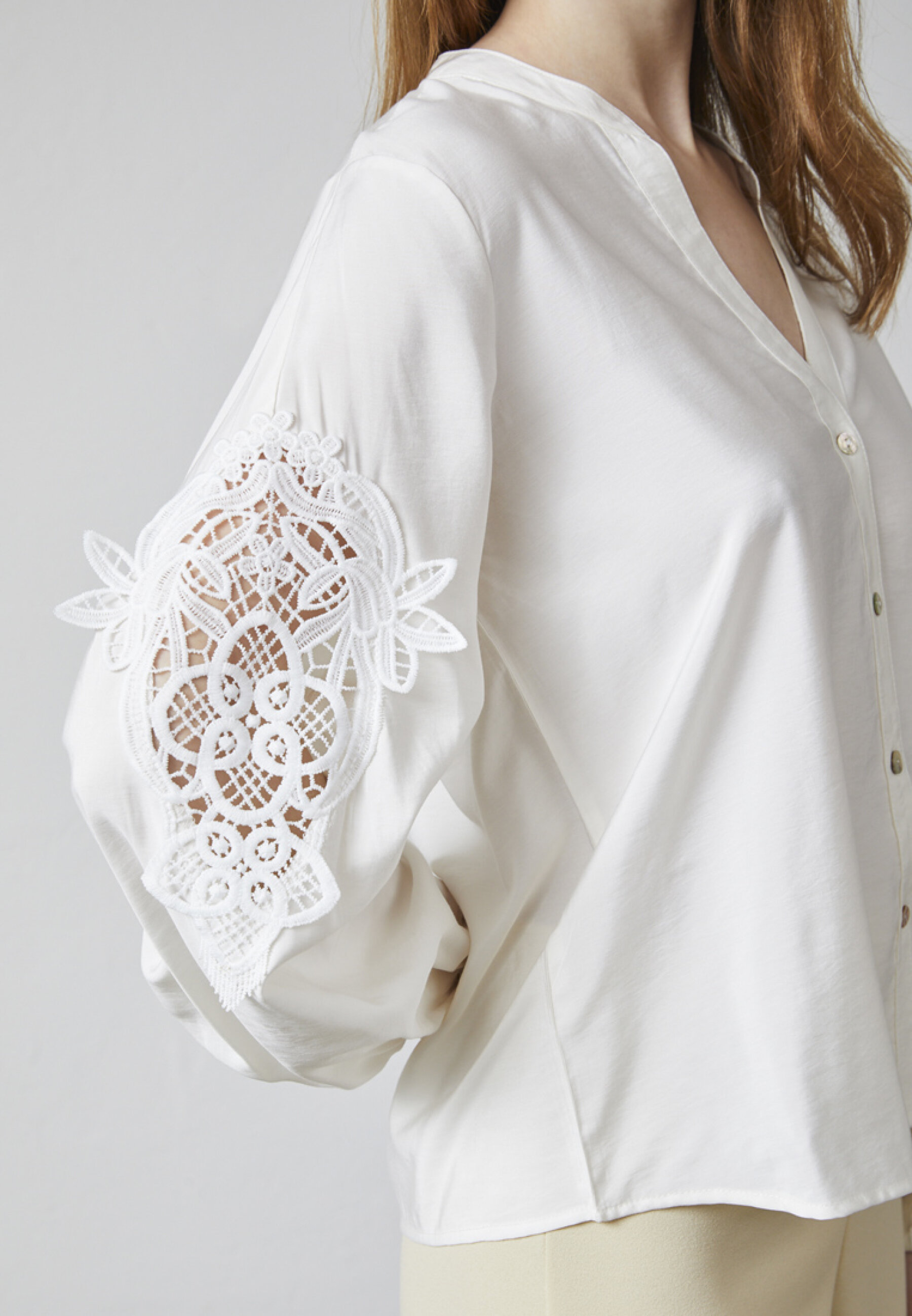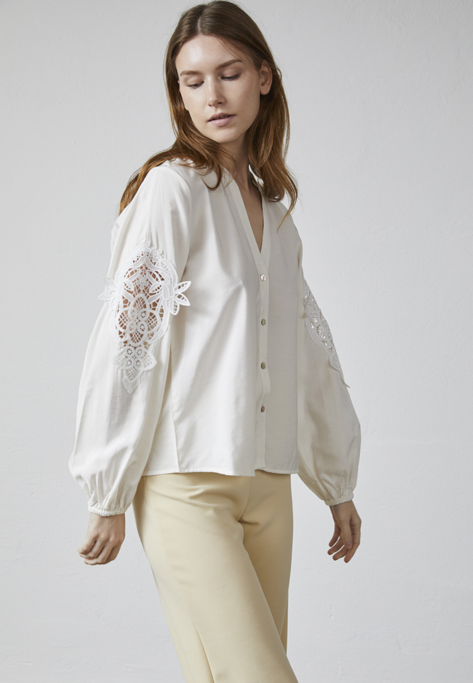VIABA-LS.SH1 er en let og luftig skjorte med lange ærmer. Skjorten har en dyb V-udskæring og lange ærmer, der afsluttes med en elastisk manchet. Skjorten er designet med fine blonde detaljer. Modellen har en str. S på