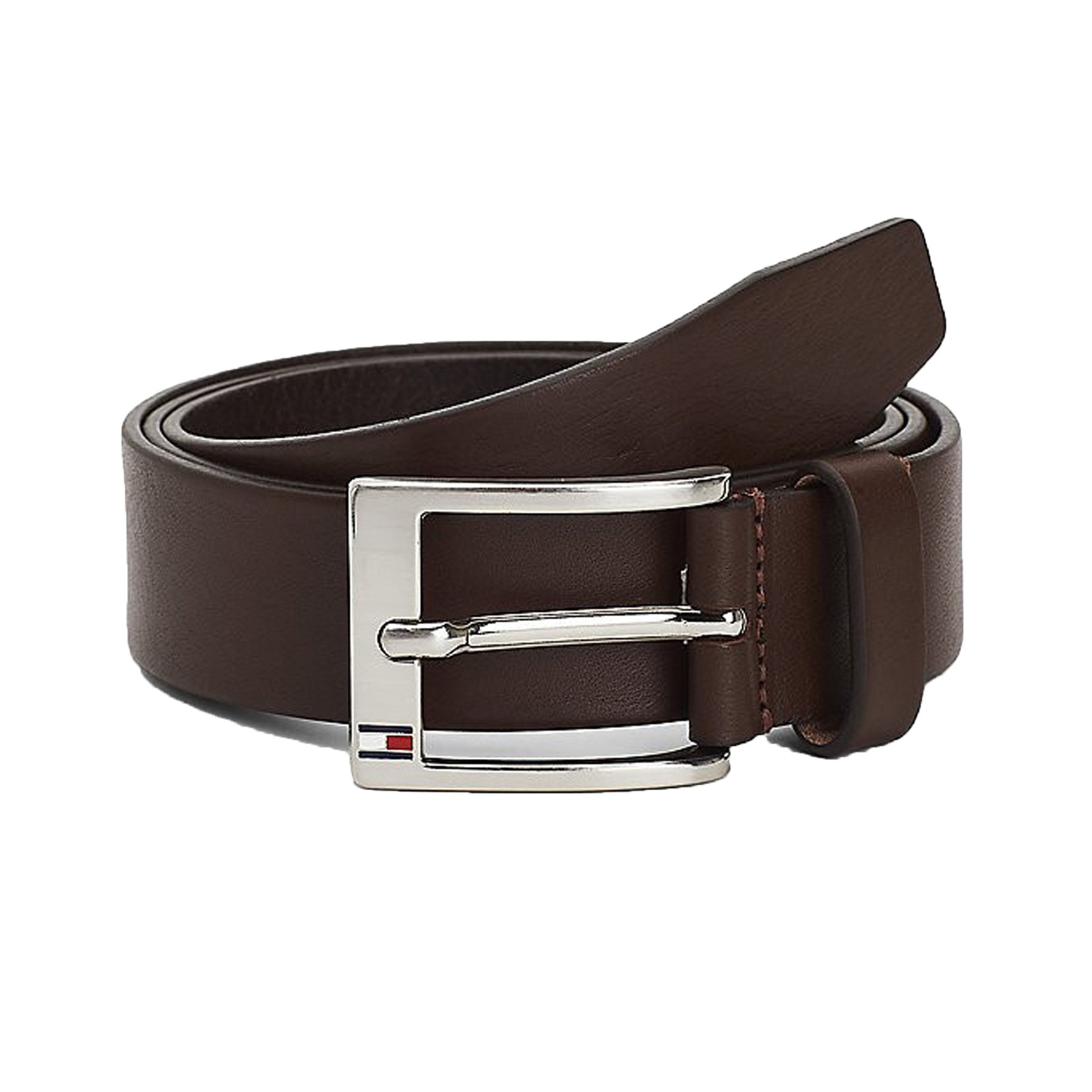 Glat mørke brun læderbælte fra Tommy Hilfiger med sølv farvet bæltespænde.