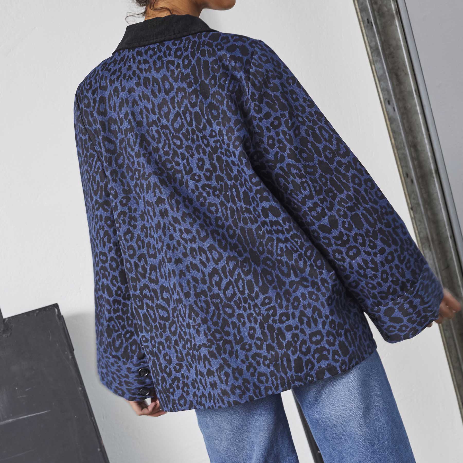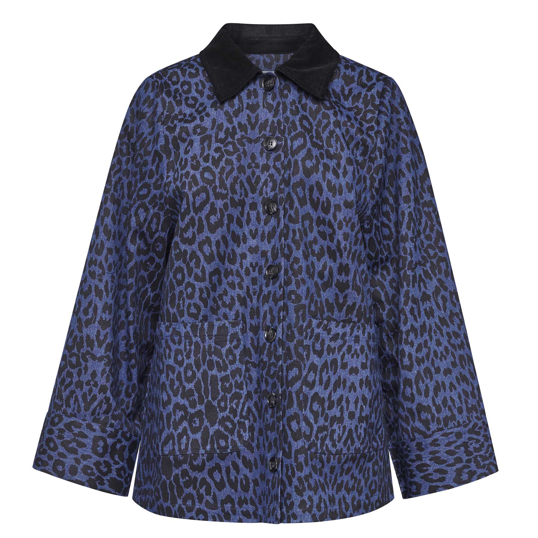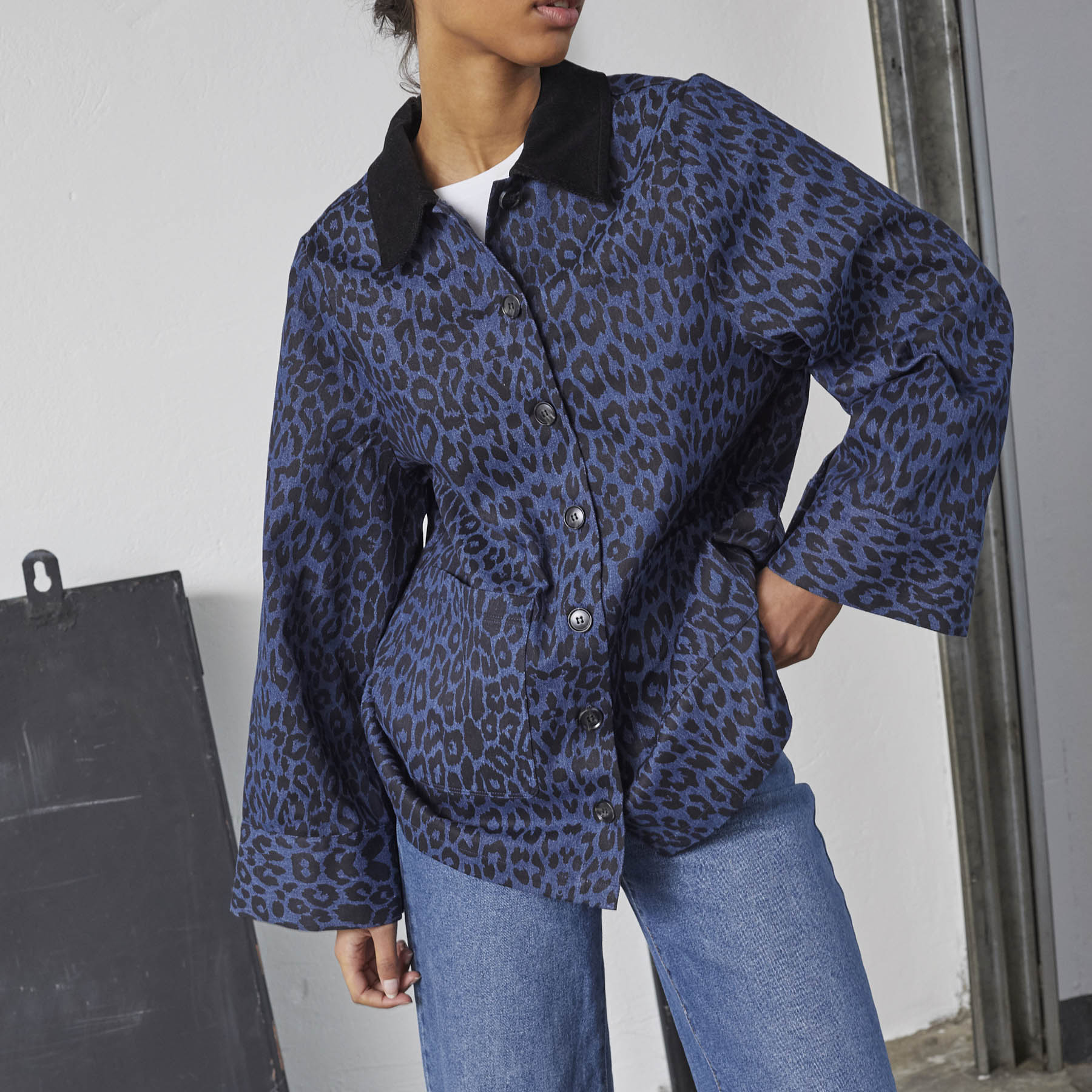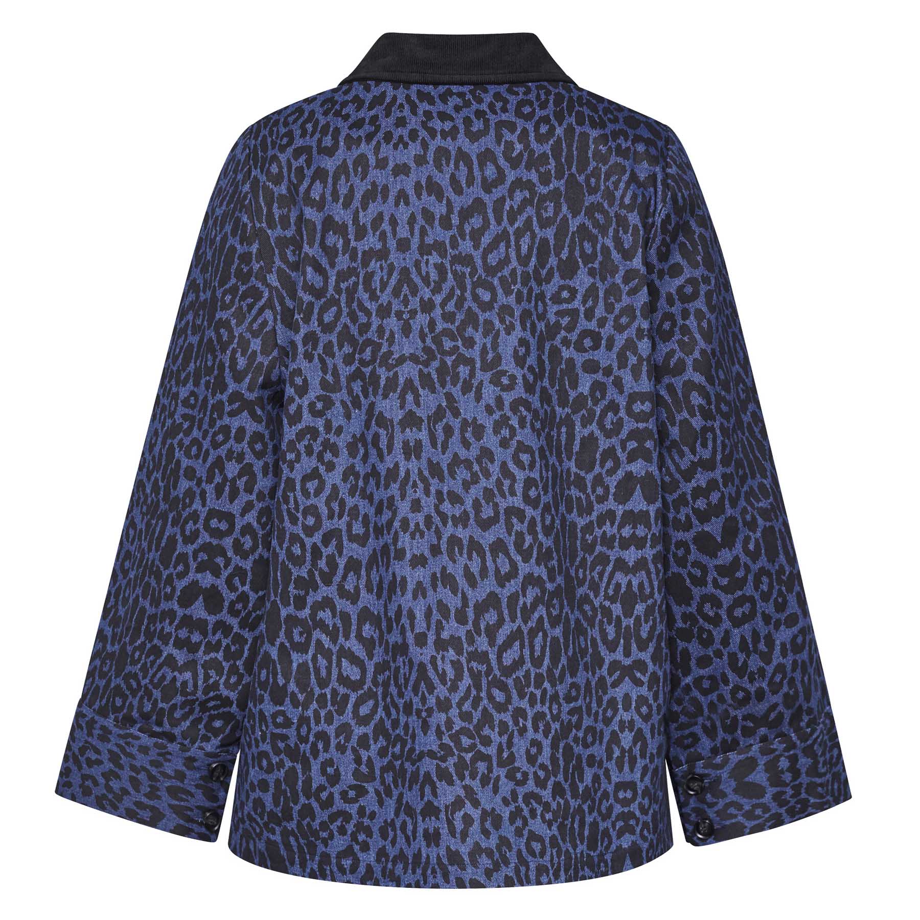 ESTIR-JA er en unik og stilfuld jakke med et iøjnefaldende leo mønster. Jakken har en krave i kontrastfarve, knaplukning og lange ærmer med vidde. Modellen har en str. S på