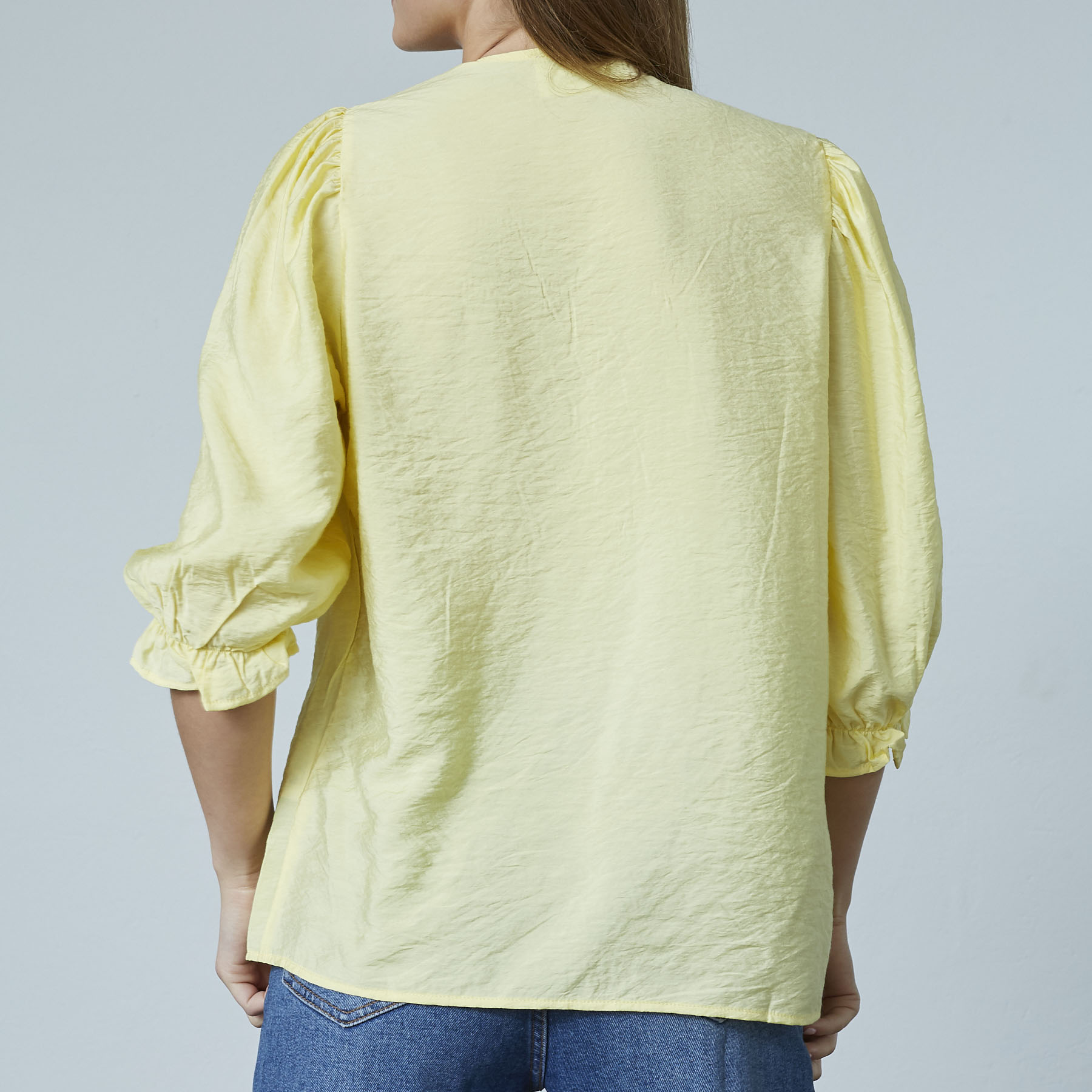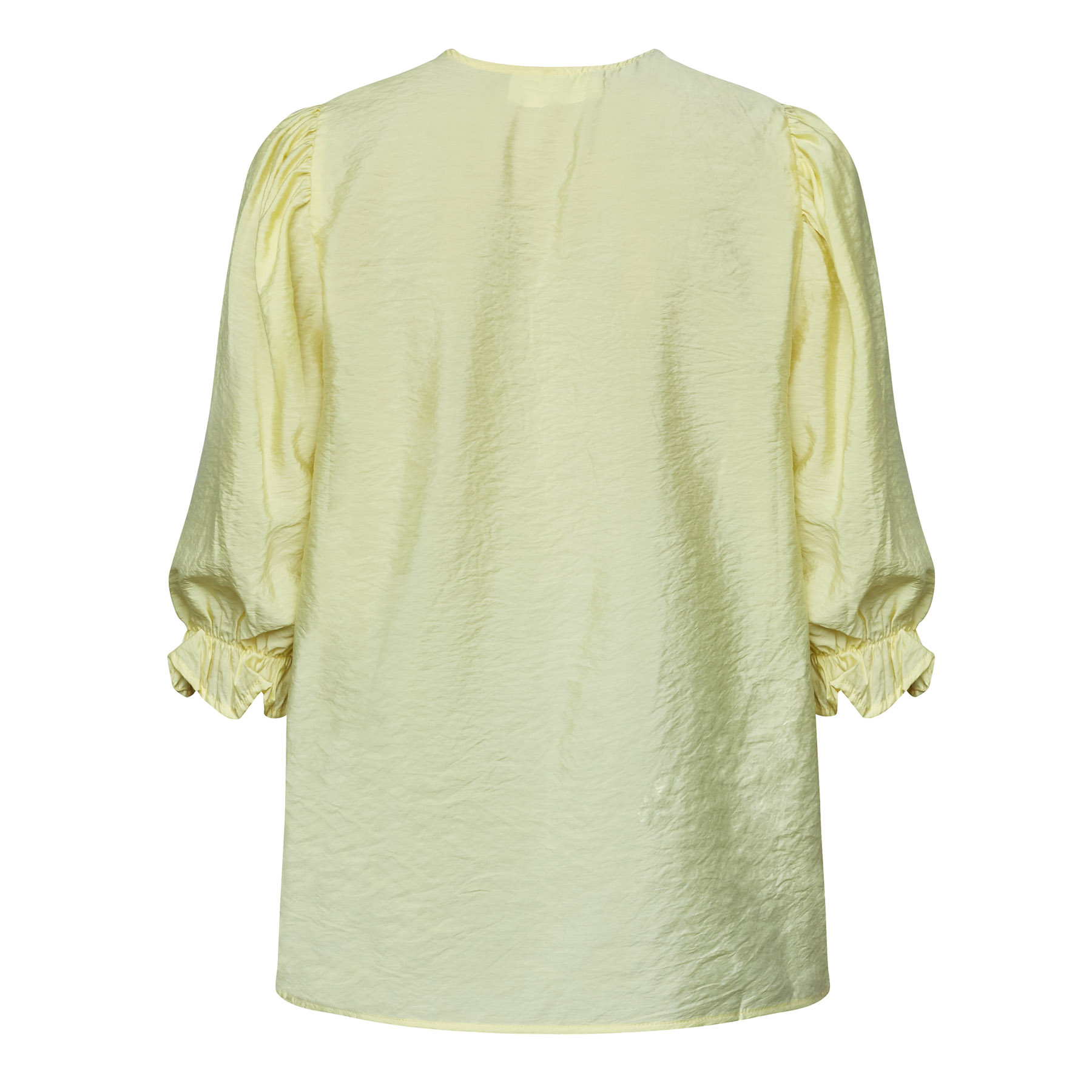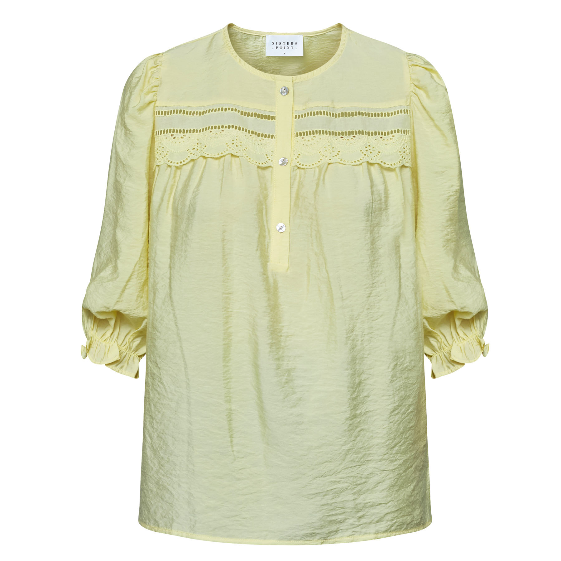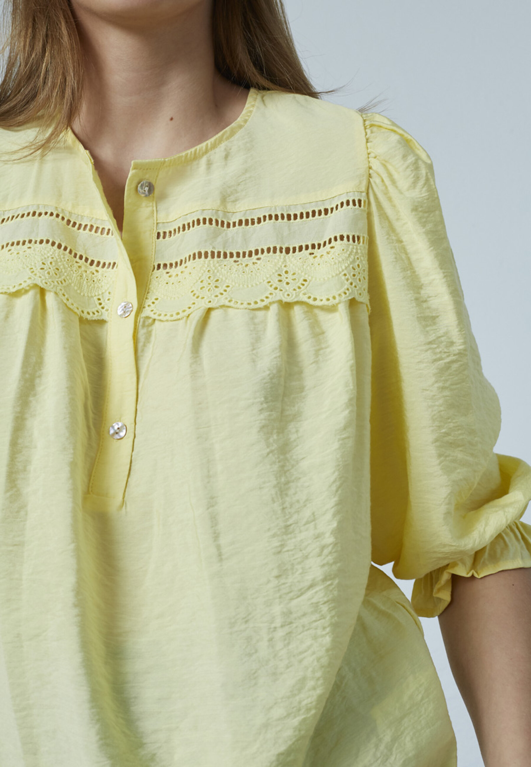 Opdag den smukke SISTERS POINT - VIDAR-SS | Skjorte i farven Pale Banana, en perfekt tilføjelse til din garderobe. Denne lette bluse er designet til den moderne kvinde, der ønsker både stil og komfort. VIDAR-SS har trekvartlange pufærmer, der afsluttes med en smal elastikkant, hvilket giver et elegant og feminint udtryk. Den runde halsudskæring med knaplukning tilføjer et sofistikeret touch, mens de dekorative hulmønstre foran på brystet skaber et unikt look. Blusen er lavet af 88% viskose og 12% polyamid, der sikrer både blødhed og åndbarhed.