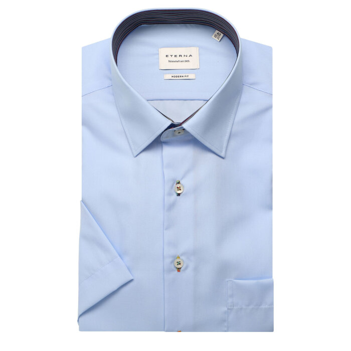 Opgrader din garderobe med Eterna skjorten med korte ærmer i en elegant blå farve. Denne skjorte er designet til den moderne mand, der værdsætter både stil og komfort. Fremstillet af 100% bomuld, tilbyder den en blød og åndbar fornemmelse, der gør den ideel til varme dage eller afslappede stunder. Den strygefri funktion sikrer, at du altid ser skarp ud, uden at skulle bruge tid på strygning.