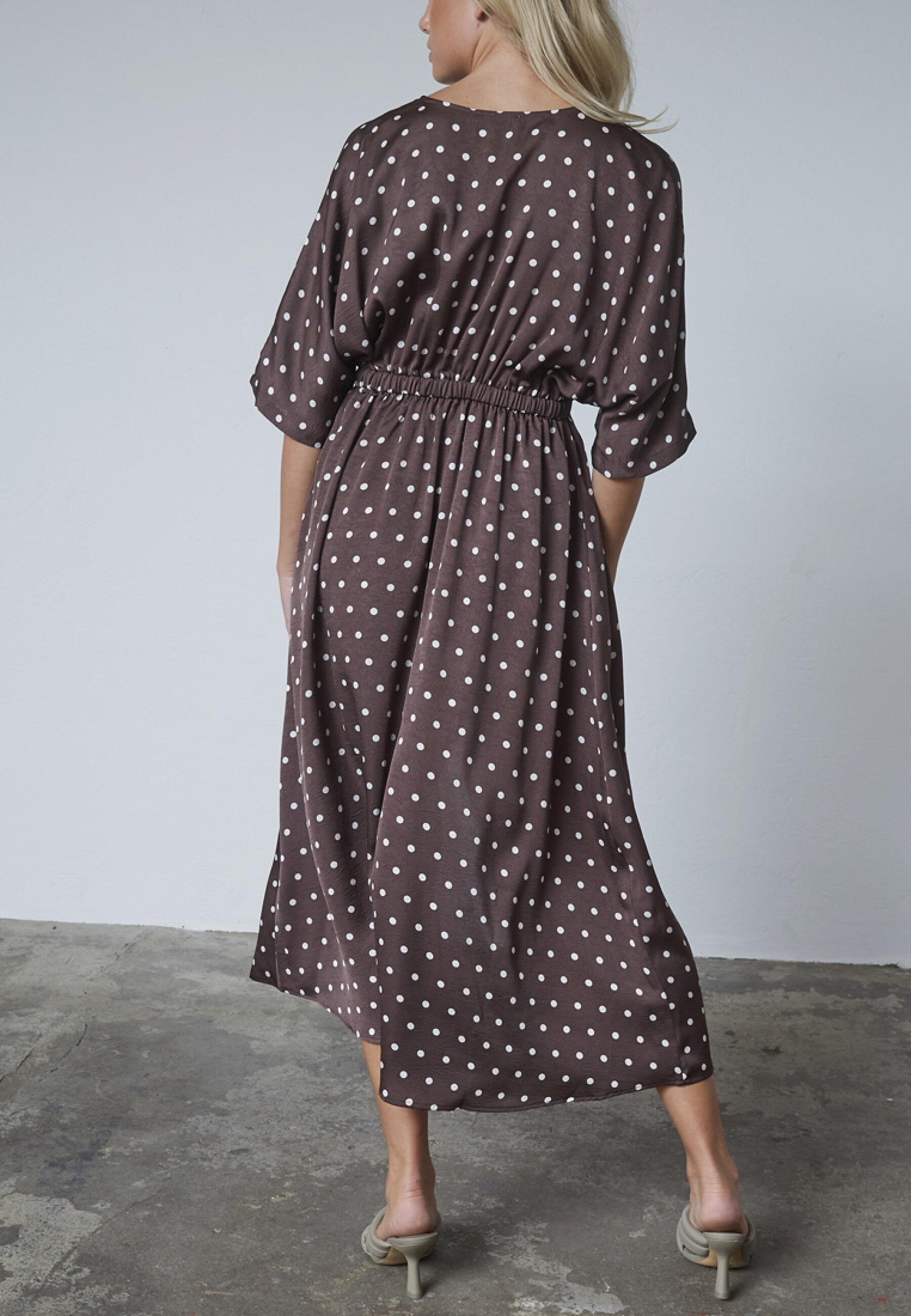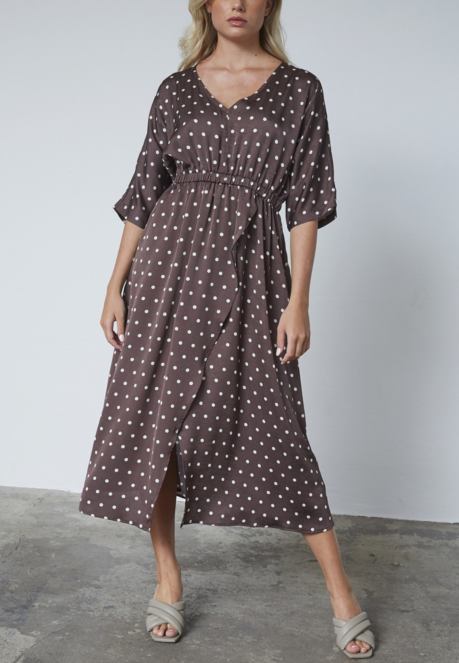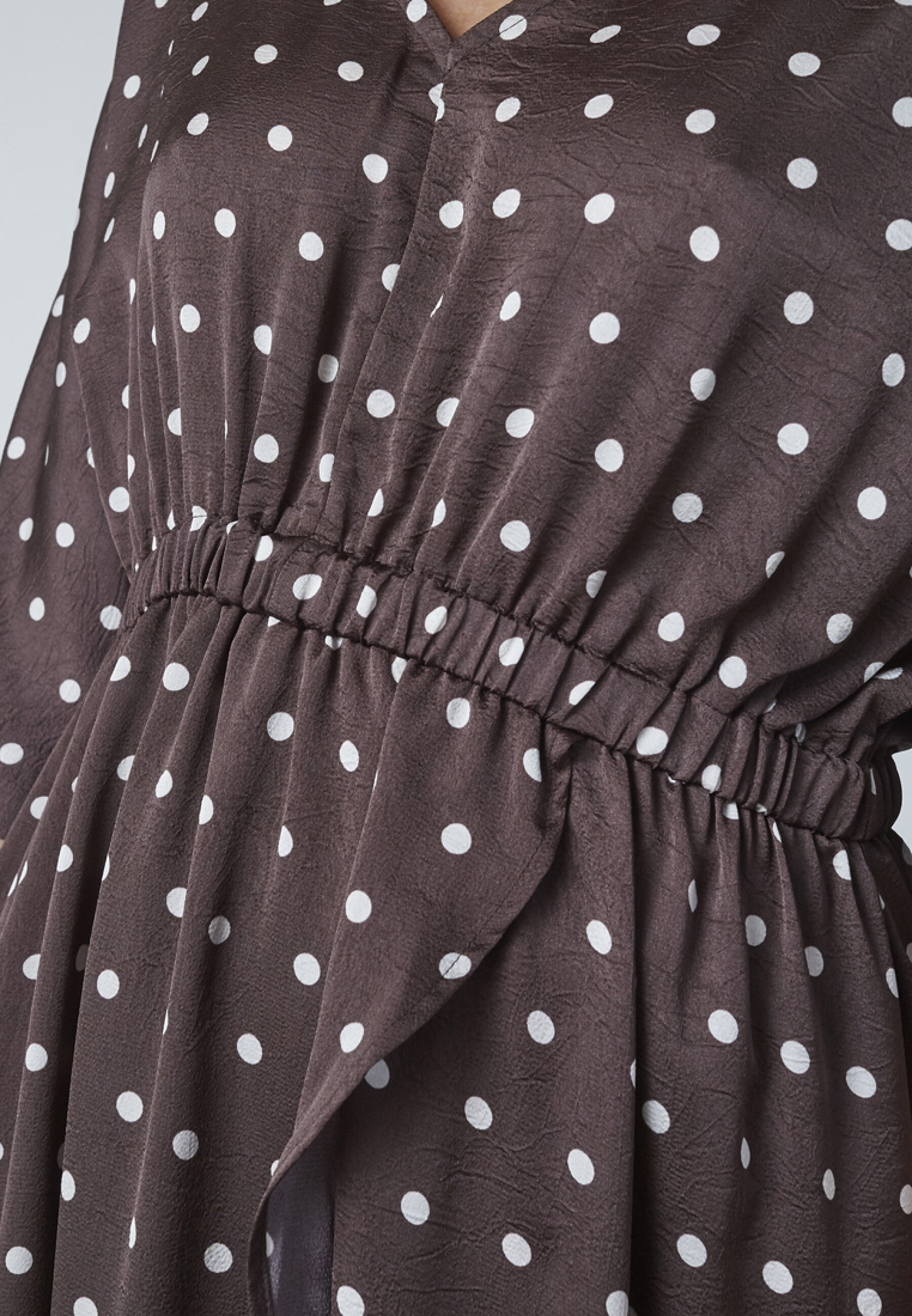 Opdag den smukke LOVE&DIVINE - LOVE1386 kjole i farven 804 BROWN/DOT, en perfekt tilføjelse til din garderobe. Denne polkaprikkede langkjole har en stilfuld v-udskæring og korte ærmer, der giver et feminint og afslappet look. Den elastiske talje sikrer en komfortabel pasform, mens det smarte slå-om design foran tilføjer et sofistikeret touch. Kjolen er lavet af 100% polyester, hvilket gør den let og behagelig at have på hele dagen.