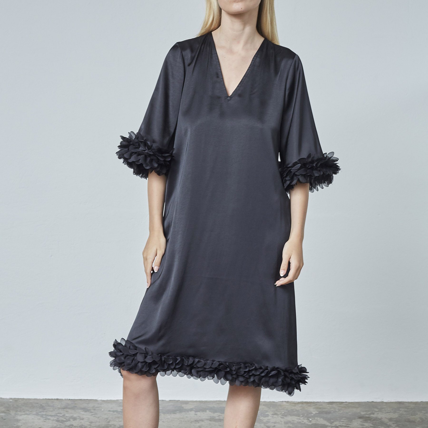 Opdag den tidløse elegance med LOVE&DIVINE - LOVE1424 kjolen i klassisk sort. Denne kjole er det perfekte valg til enhver lejlighed, hvad enten du skal til fest, middag eller blot ønsker at se godt ud i hverdagen. Den er fremstillet af en blød og behagelig blanding af 46% viscose og 54% polyester, der sikrer en god pasform og komfort hele dagen lang.