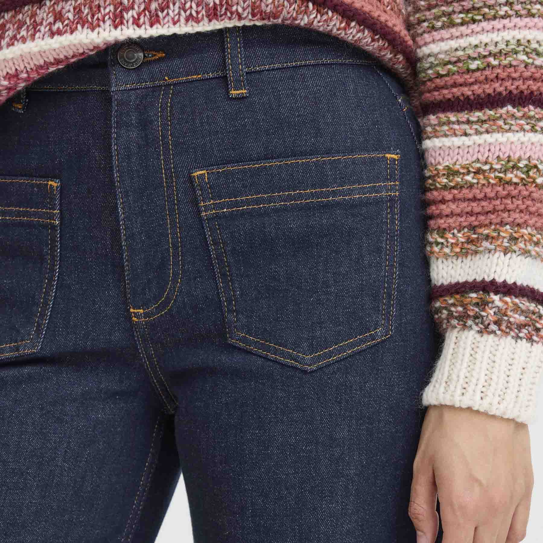 Fremstillet af 99% bomuld og 1% elastan, tilbyder disse jeans en fantastisk komfort og stræk, så du kan bevæge dig frit hele dagen. Den dybe mørkeblå farve giver et tidløst og alsidigt udtryk, der nemt kan styles med alt fra en simpel t-shirt til en flot bluse.