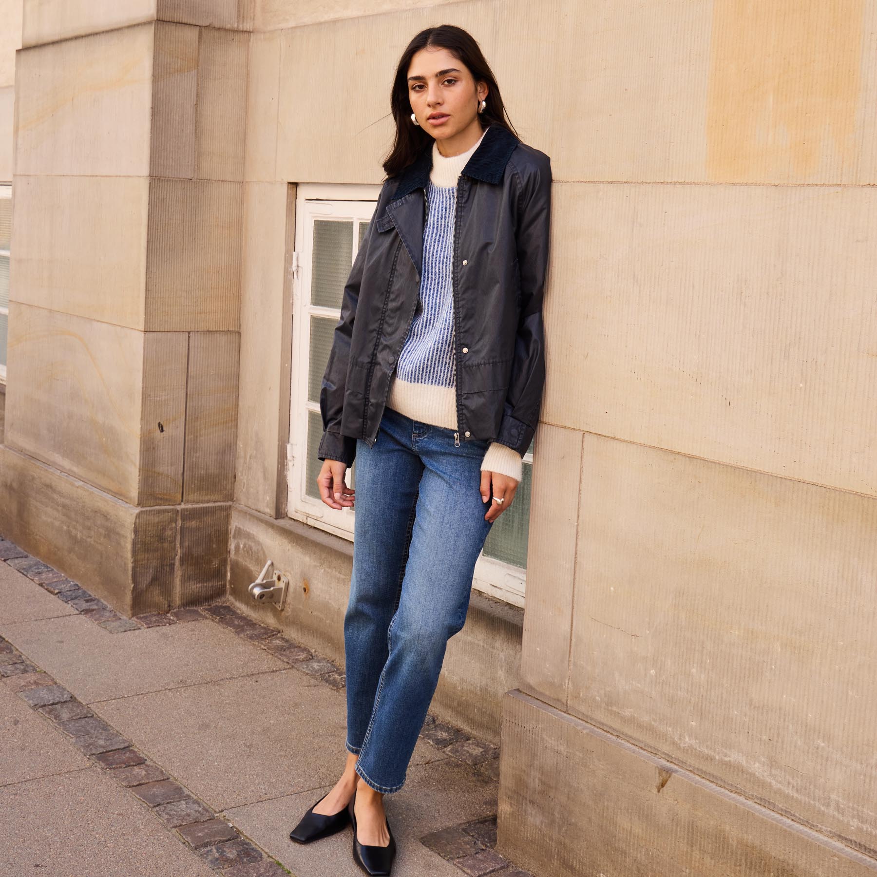Med sin regulære pasform passer denne jakke til de fleste kropstyper og fås i størrelserne 34, 36, 38 og 40. Den mørke navy farve giver et tidløst touch, der nemt kan styles med enhver garderobe. Uanset om du skal på en aftenudflugt eller blot ønsker at holde dig varm i det danske vejr, er IHGANILO JA vindjakken et must-have i din samling af damejakker.