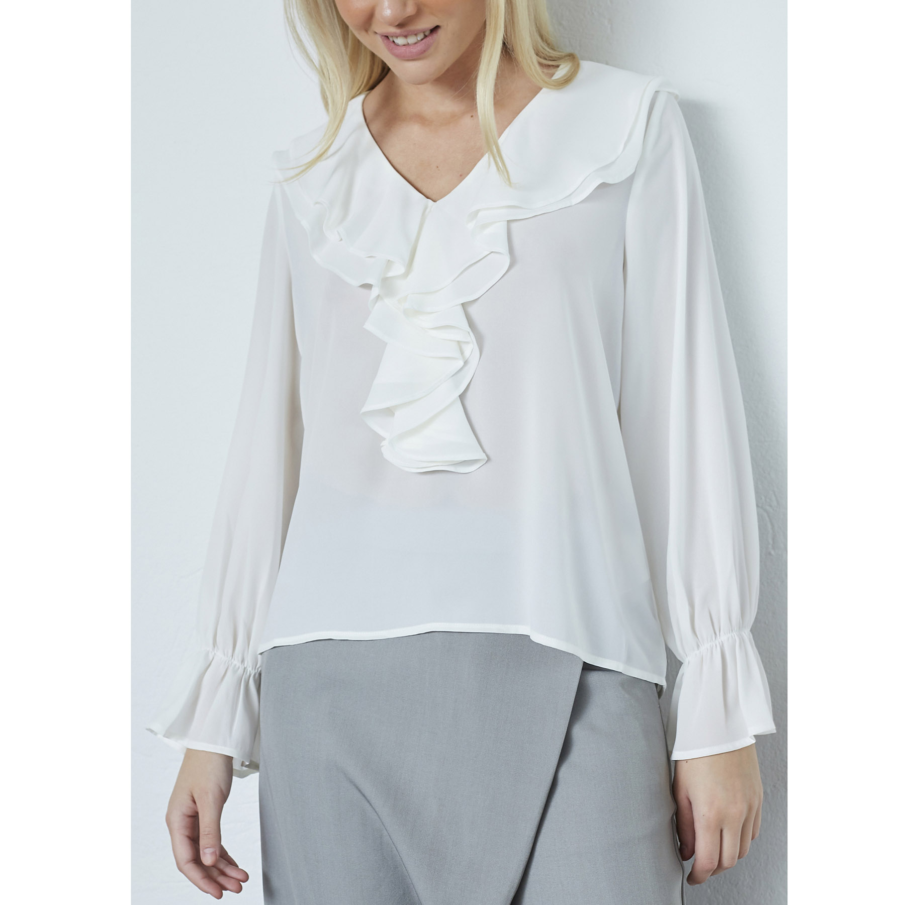 Med sit feminine design og flotte flæser tilføjer denne bluse et strejf af charme til din garderobe. Den kommer i den smukke farve 115 CREAM, der er ideel til at kombinere med både jeans og nederdele. Uanset om du skal til brunch med veninderne eller en aften i byen, vil denne bluse være dit go-to valg.