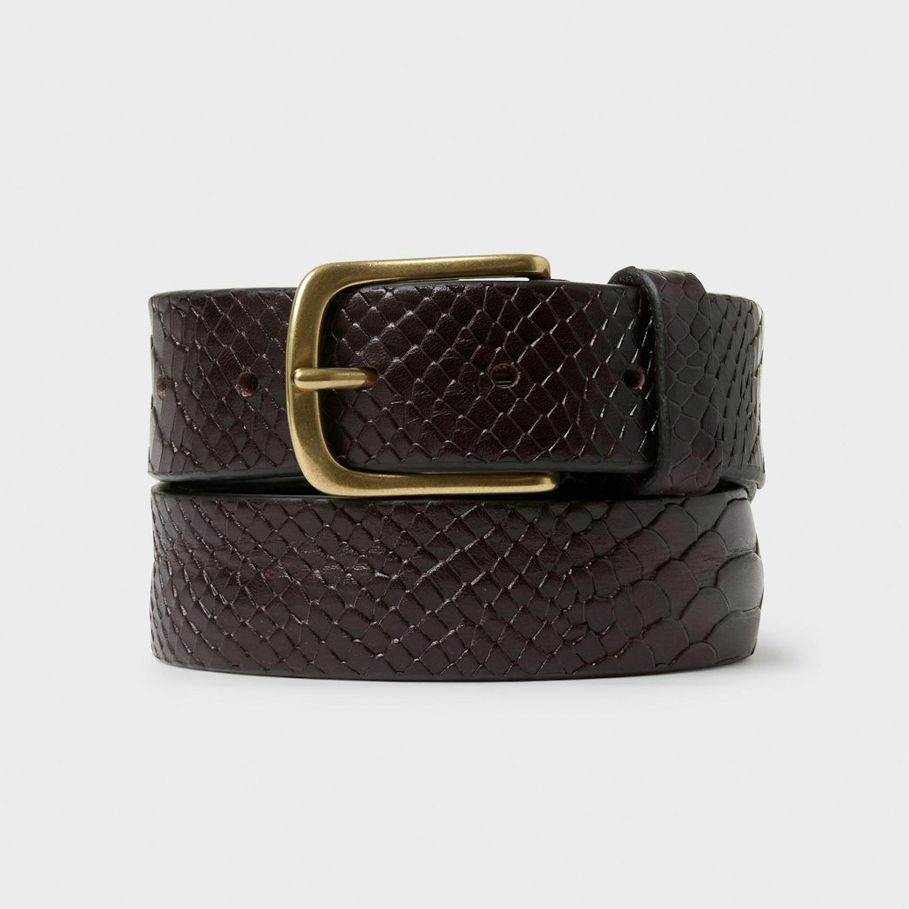 Opdag Saddler - 78915 Luca Bælte i mørkebrun, et must-have til din garderobe. Dette 3,5 cm brede bælte er lavet af full grain læder og præsenterer et sofistikeret look, der kan løfte ethvert outfit. Bæltet er fremstillet i vegetabilsk garvet læder og har et elegant præget anacondamønster, som er certificeret af Leather Working Group. Den karakterfulde overflade og den antikgyldne spænde giver bæltet en eksklusiv fornemmelse, mens den robuste finish tilføjer et råt, håndlavet udtryk.