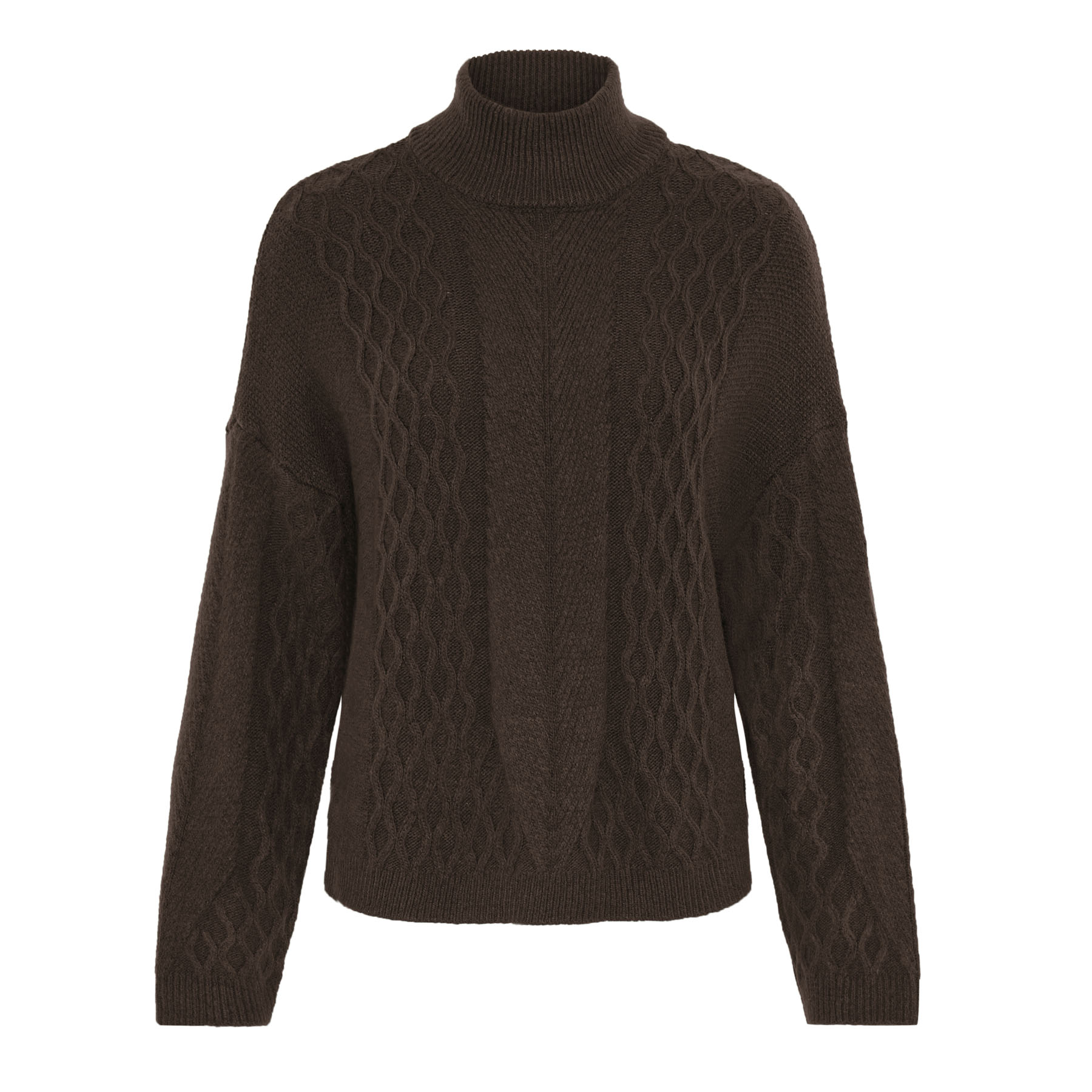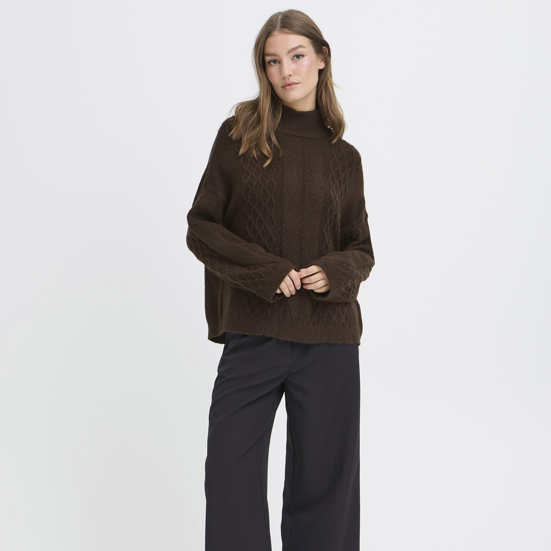 IHMYLLE LS6 har et klassisk kabelstrikdesign med en høj hals, der tilføjer et moderne touch til enhver garderobe. Trøjen fås i størrelse XS til XL, så du kan finde den perfekte pasform til din kropstype. Fit er normal, hvilket betyder, at den sidder behageligt uden at være for stram.