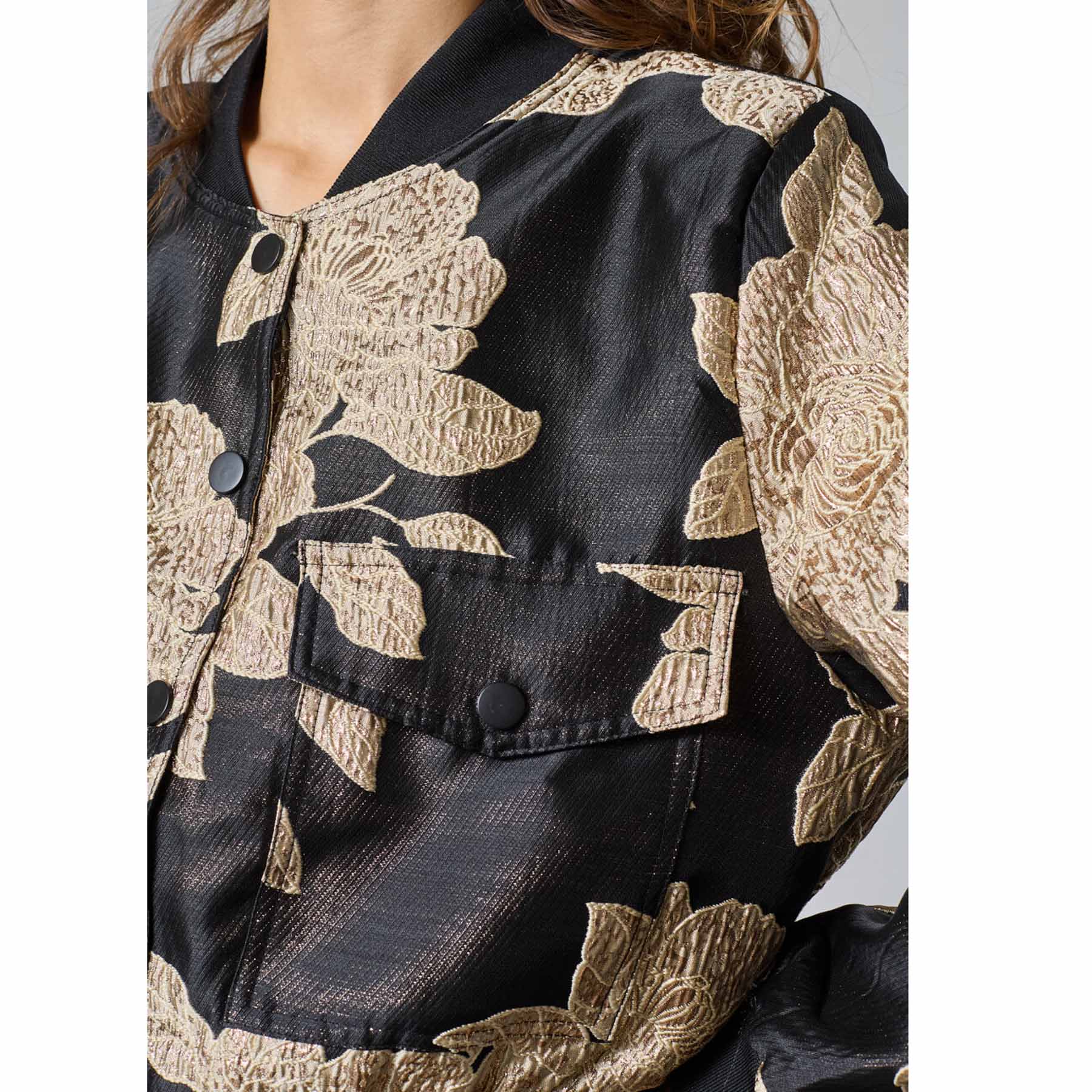 Oplev den stilfulde SISTERS POINT - GARWIN-JA22 jakke i en elegant sort/guld farvekombination. Denne bomberjakke er designet med et overordnet mønster, der giver et moderne og unikt udtryk. Jakken har ribstrikkede kanter, som tilføjer en sporty detalje og sikrer en god pasform. Med en praktisk gennemgående knaplukning og store forlommer er GARWIN-JA22 både funktionel og trendy.