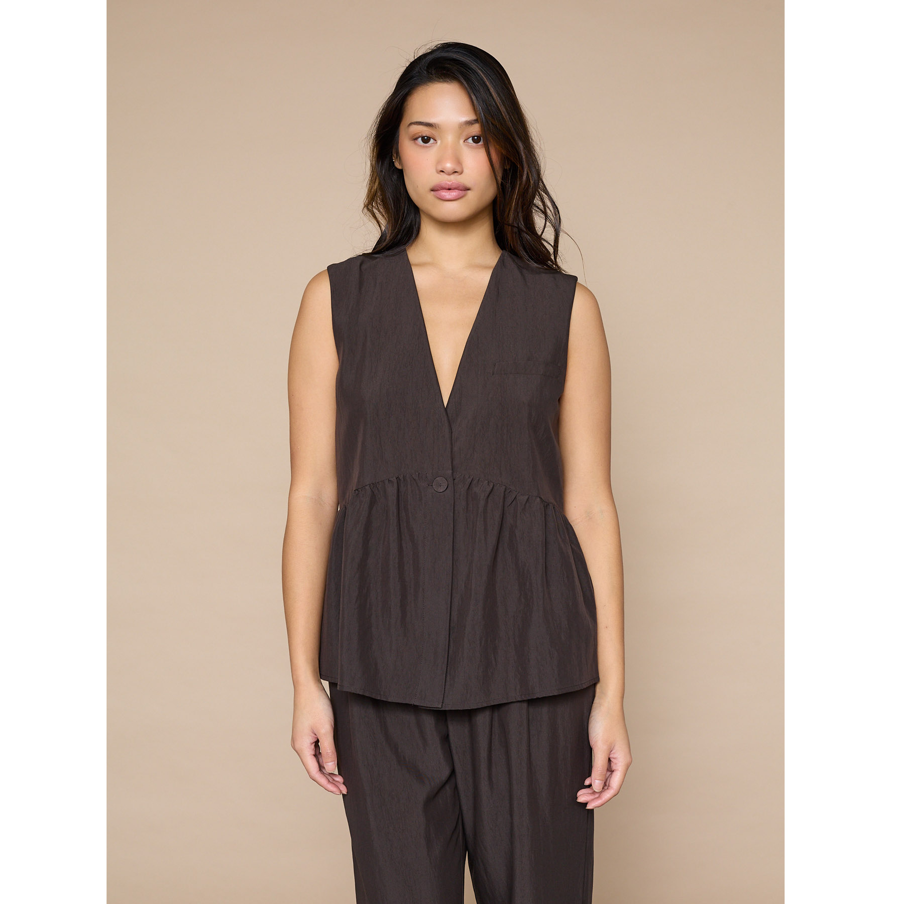 Toppen er fremstillet af lette, åndbare materialer, der sikrer en behagelig pasform hele dagen. Med en normal pasform, der elegant omfavner kroppens kurver, er denne top ideel til både hverdag og fest. Den dybe chokoladefarve tilføjer et sofistikeret touch til din garderobe og kan nemt styles med både jeans og nederdele.