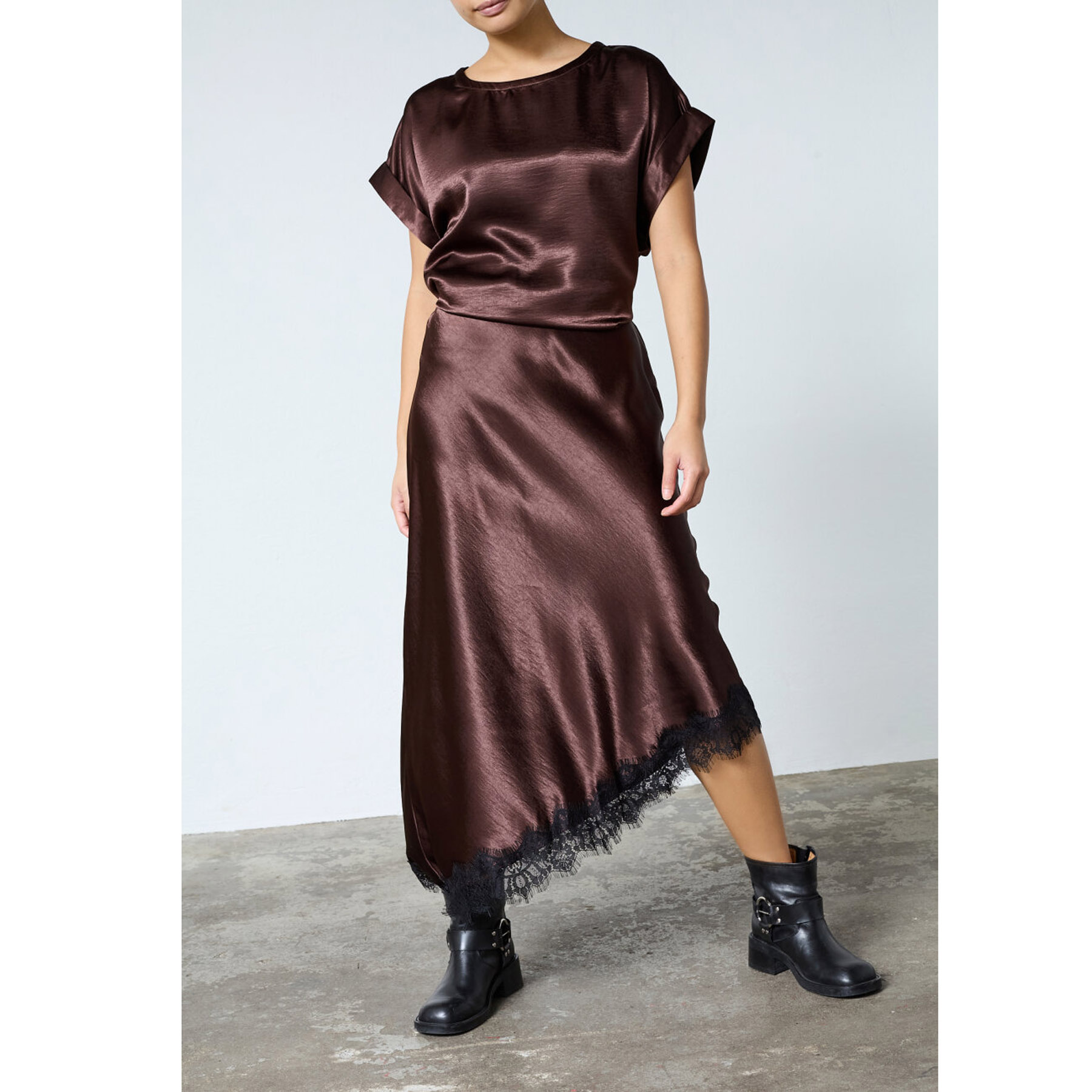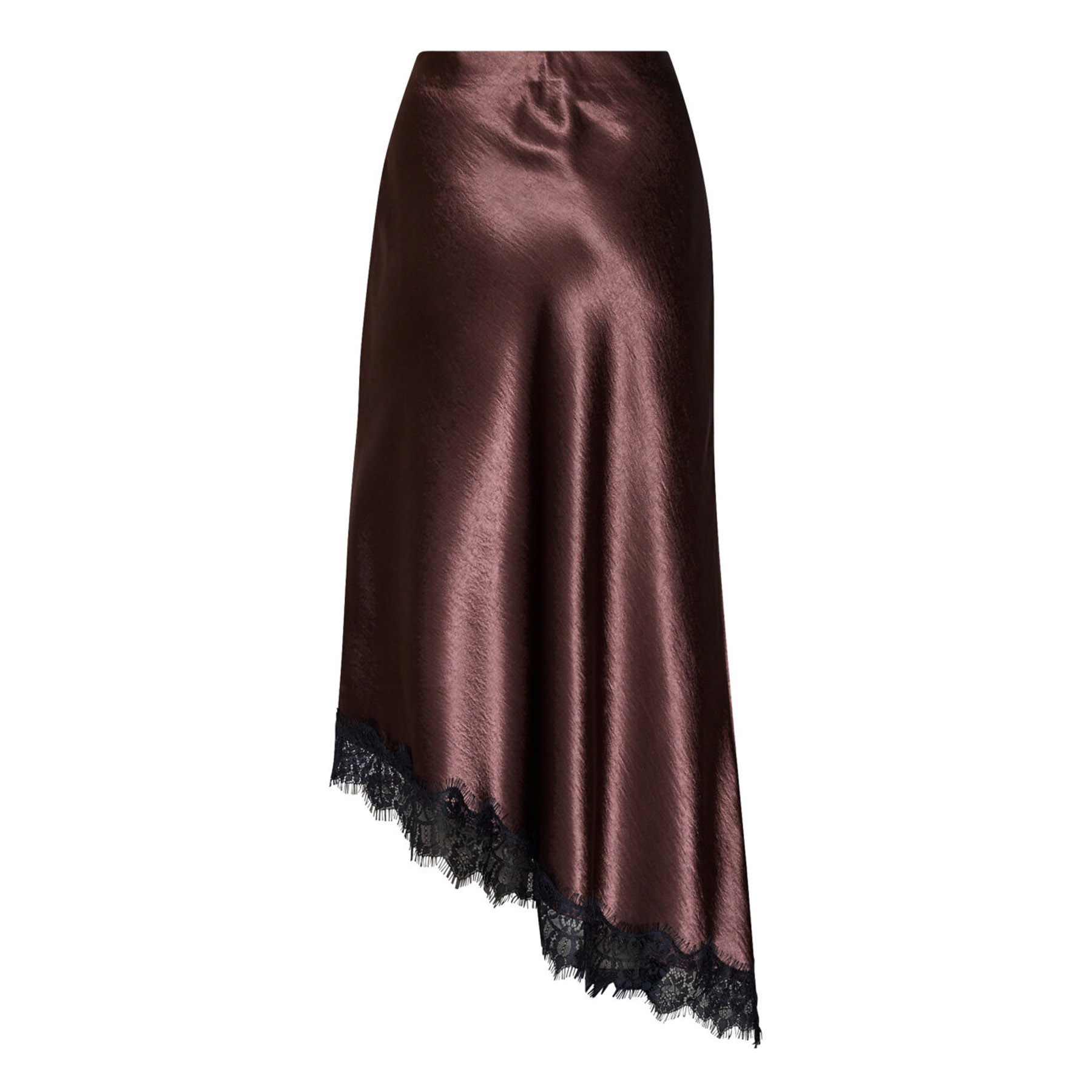 GEWO-LACE. SK har et asymmetrisk snit med en skråt afskåret kant, der giver et unikt og trendy udtryk. Det delikate blonde-detalje langs kanten tilføjer et feminint præg, hvilket gør denne nederdel perfekt til både hverdag og fest.