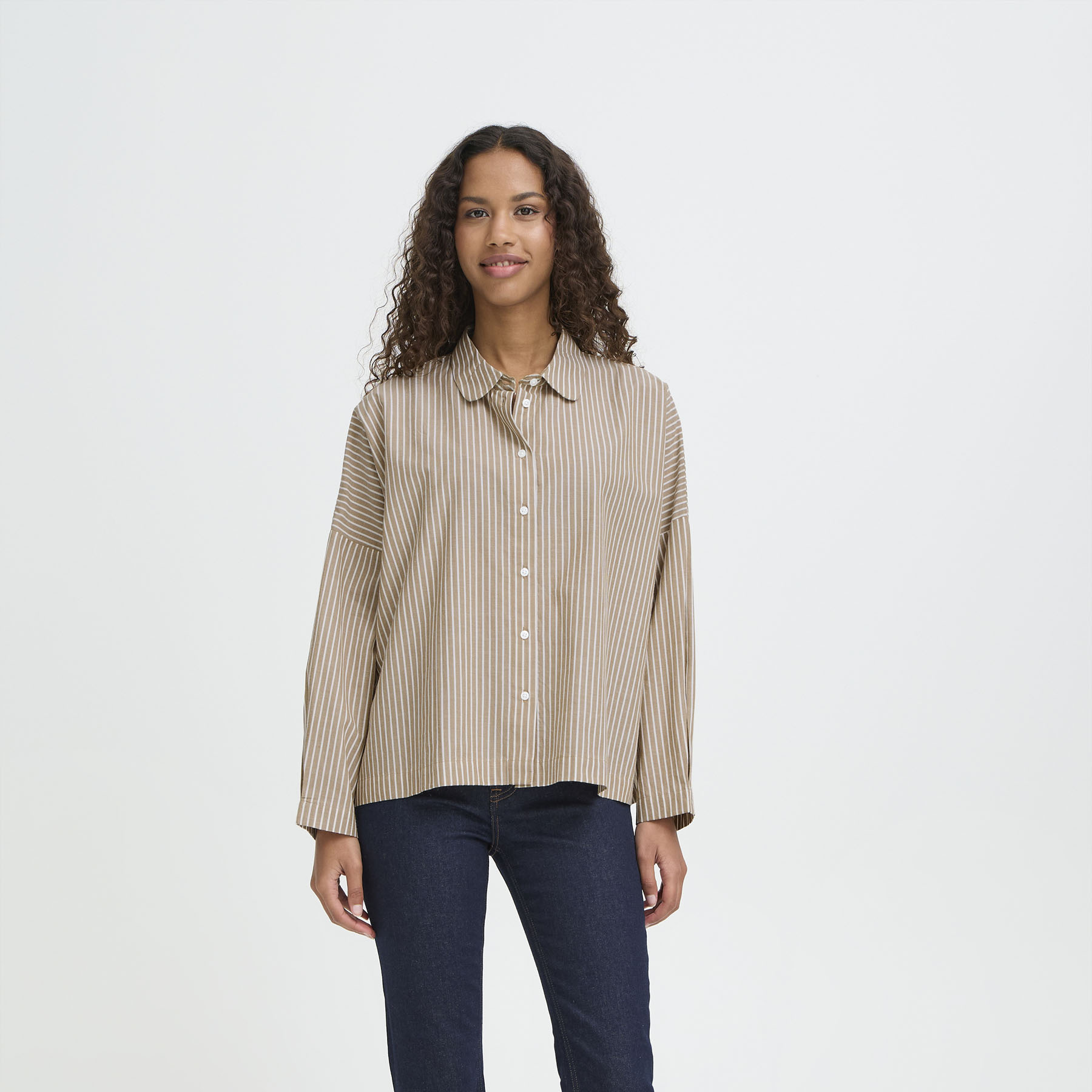 Opdag ICHI - IHGILEY SH, en stilfuld oversize skjorte i en smuk kombination af farverne Birch og Sepia. Denne skjorte er perfekt til den moderne kvinde, der ønsker at kombinere komfort med elegance. Fremstillet af 100% bomuld, tilbyder den en blød og behagelig fornemmelse mod huden, samtidig med at den sikrer åndbarhed hele dagen lang.