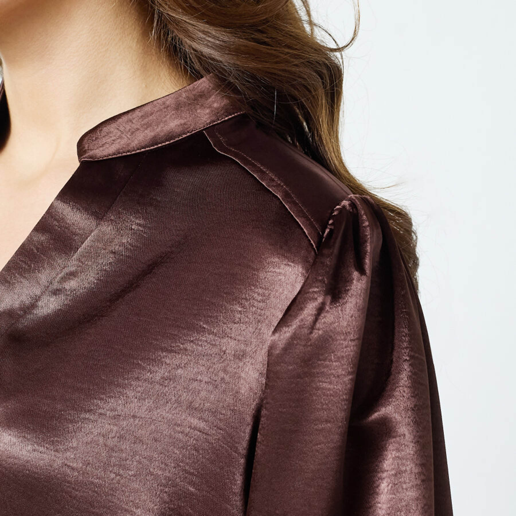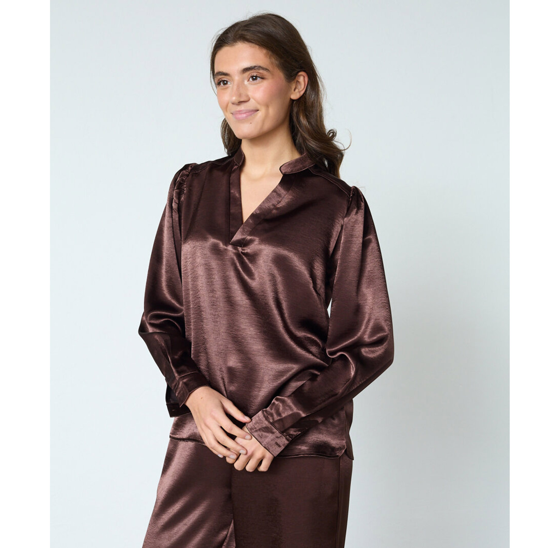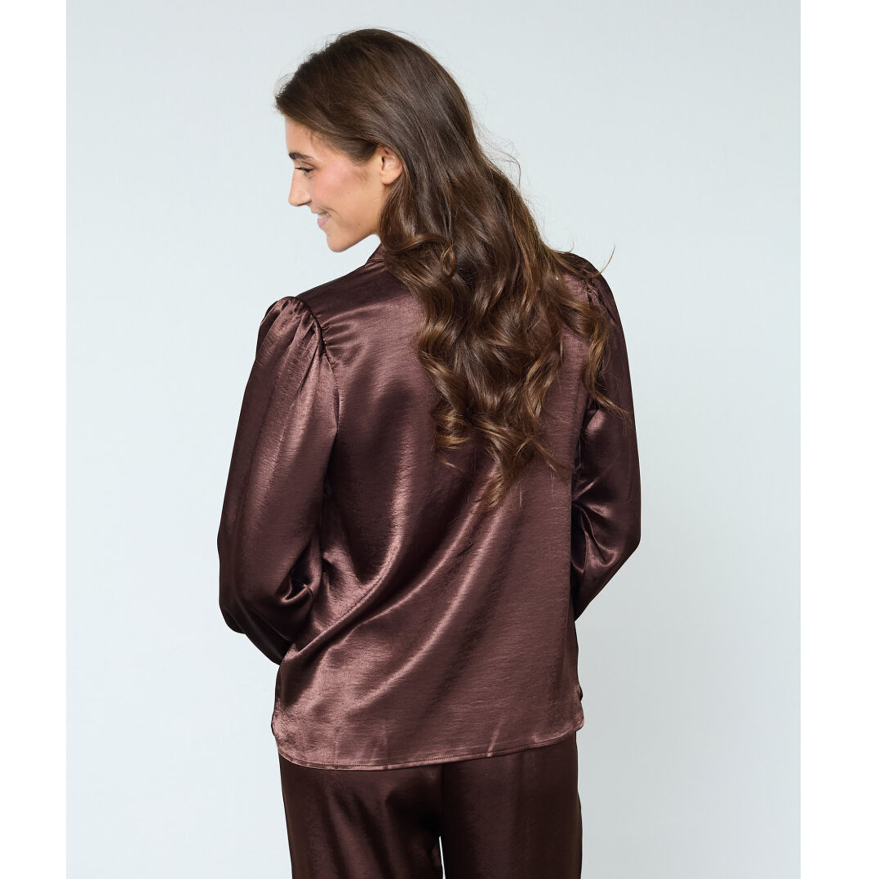 Opdag den elegante GISNA-LS skjorte fra Sisters Point, der er designet til den moderne kvinde. Denne langærmede bluse i en smuk brun farve er fremstillet af 100% polyester, hvilket giver den et glansfuldt og luksuriøst udseende. Blusen har en dyb V-udskæring med en lille krave, som tilføjer et feminint touch til dit outfit. Ærmerne er samlet ved skulderen for at skabe en let puf-effekt, der giver en smuk silhuet og afsluttes med en elegant manchet.