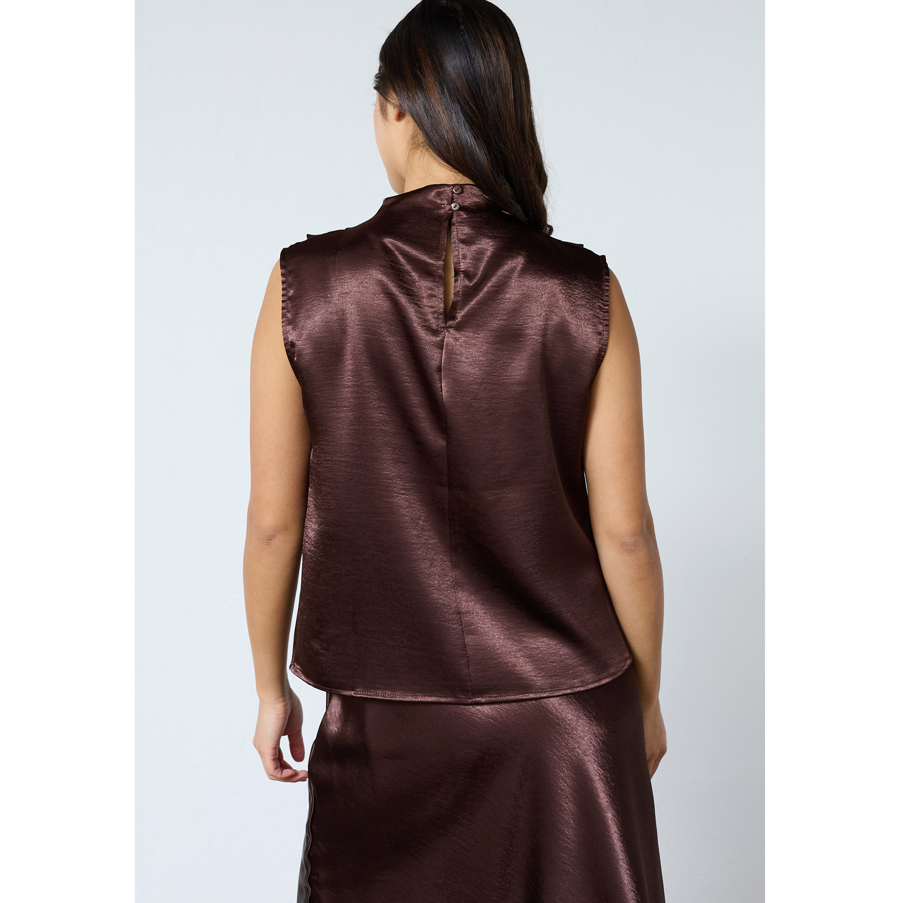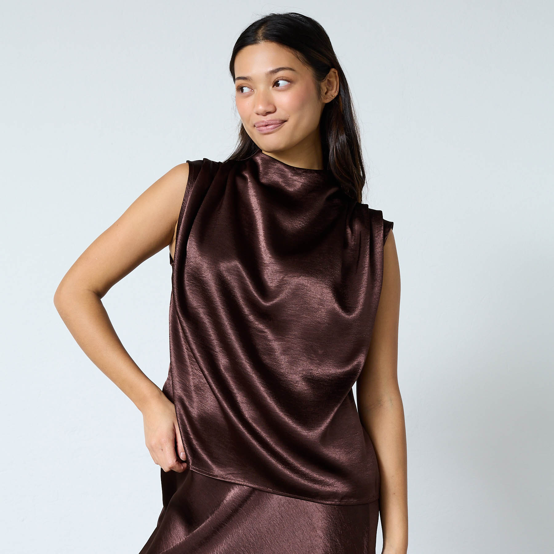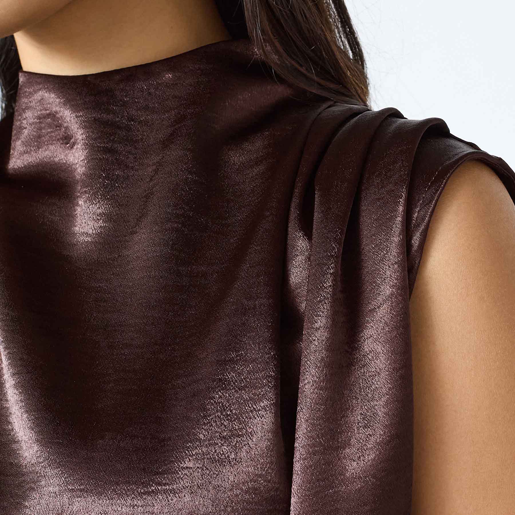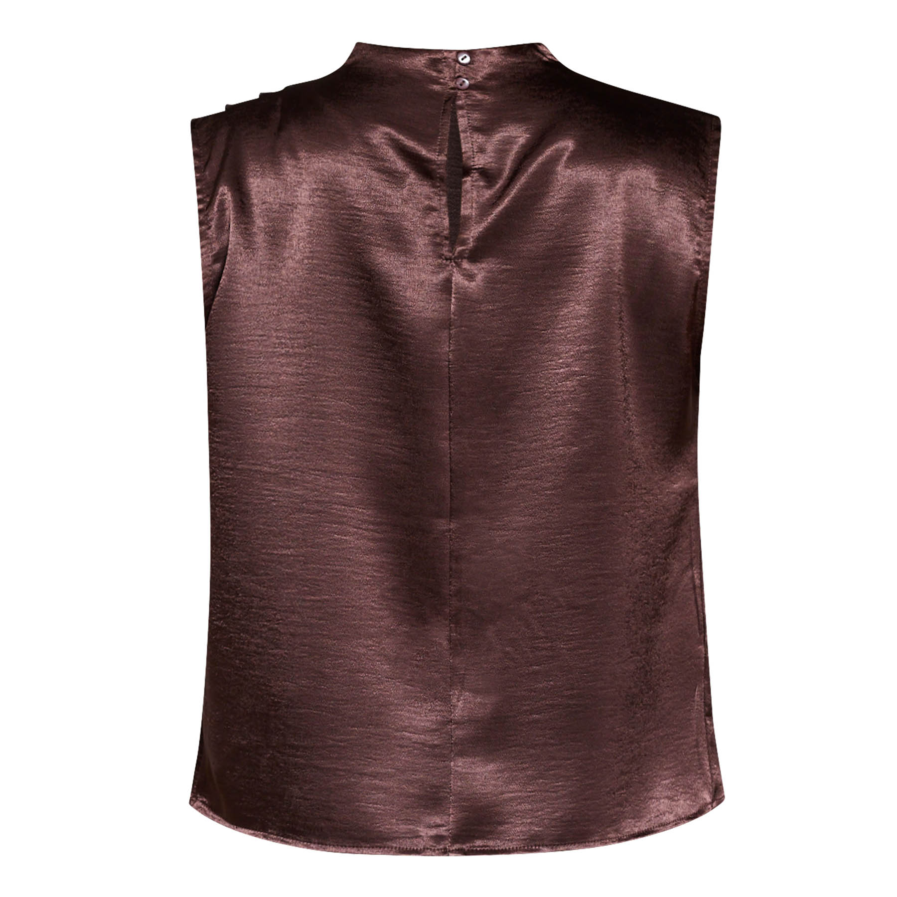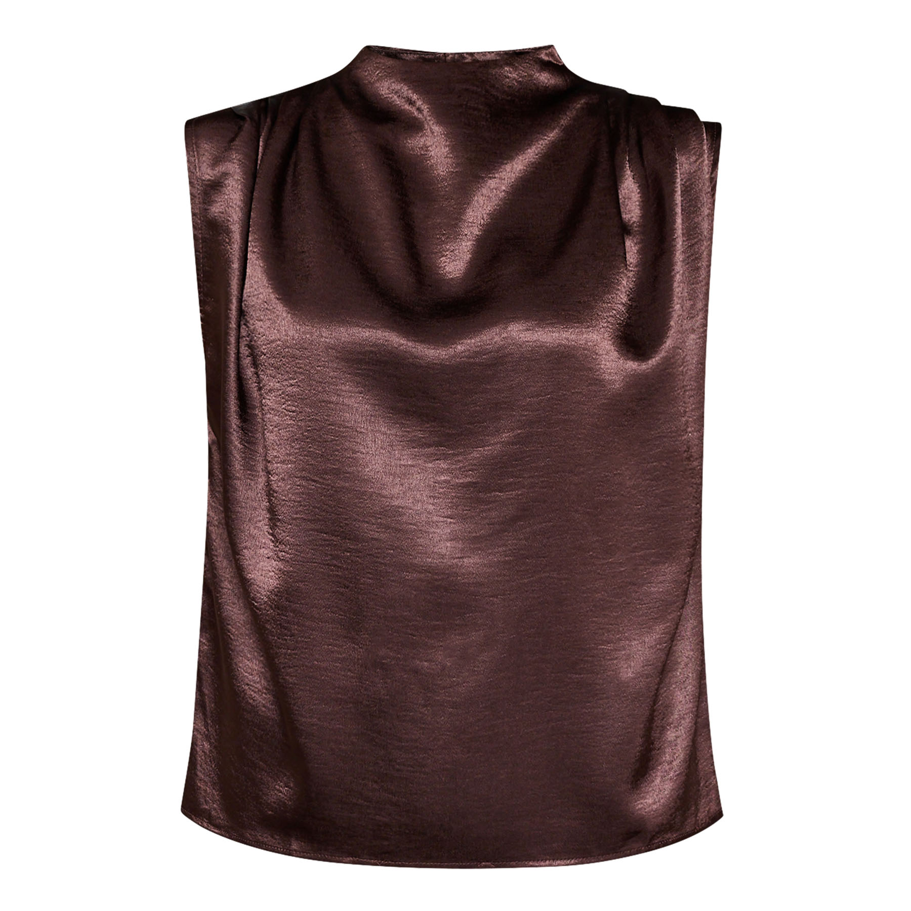 Oplev den stilfulde GUTO-SL1 top fra Sisters Point, perfekt til den moderne kvinde. Denne ærmeløse bluse i en smuk chokoladefarve (222 D. CHOCOLAT) er fremstillet af 100% polyester, hvilket giver en skinnende satin look og et flydende, behageligt materiale, der falder smukt på kroppen. Toppen har en draperet front og en let opretstående hals, der tilføjer et elegant touch til dit outfit.