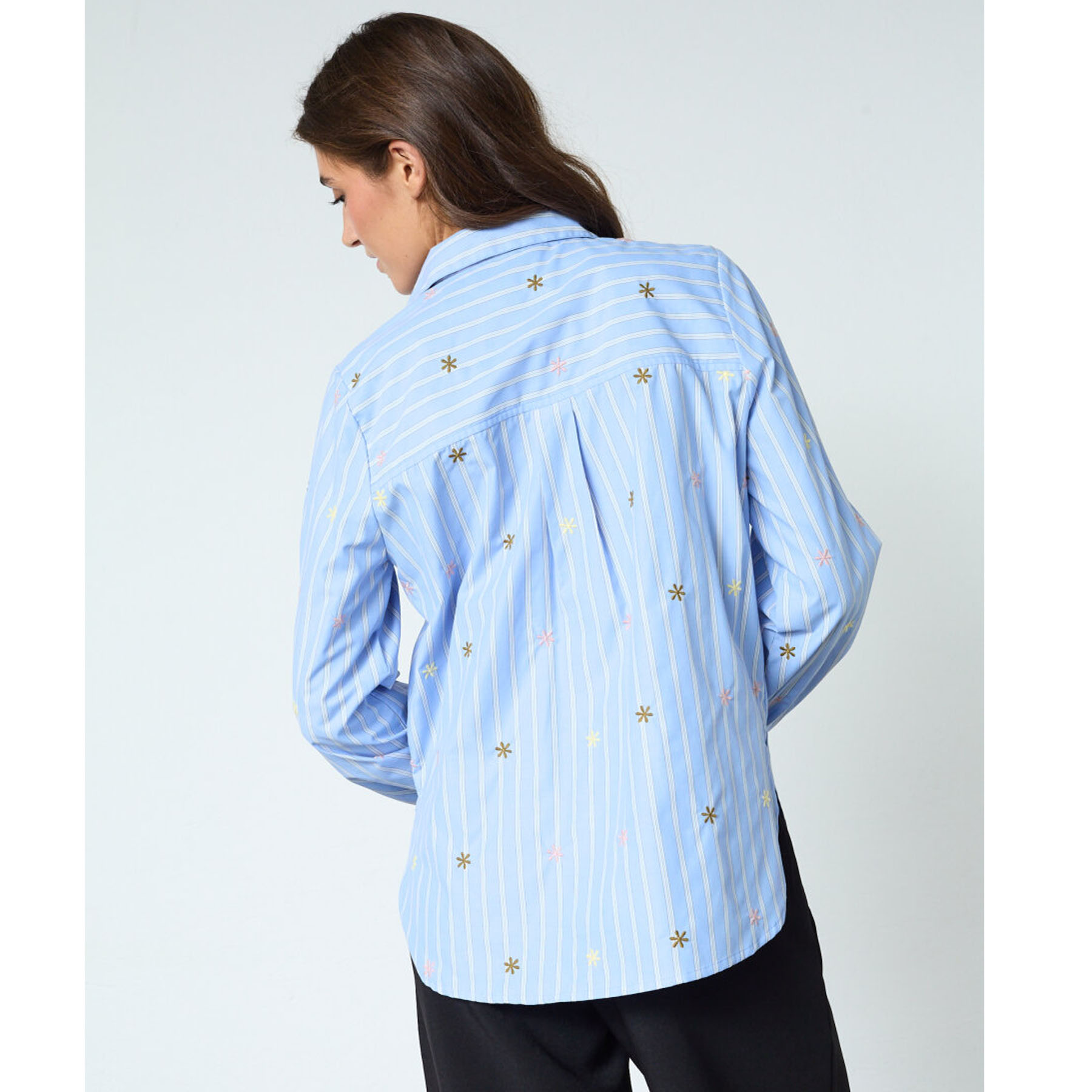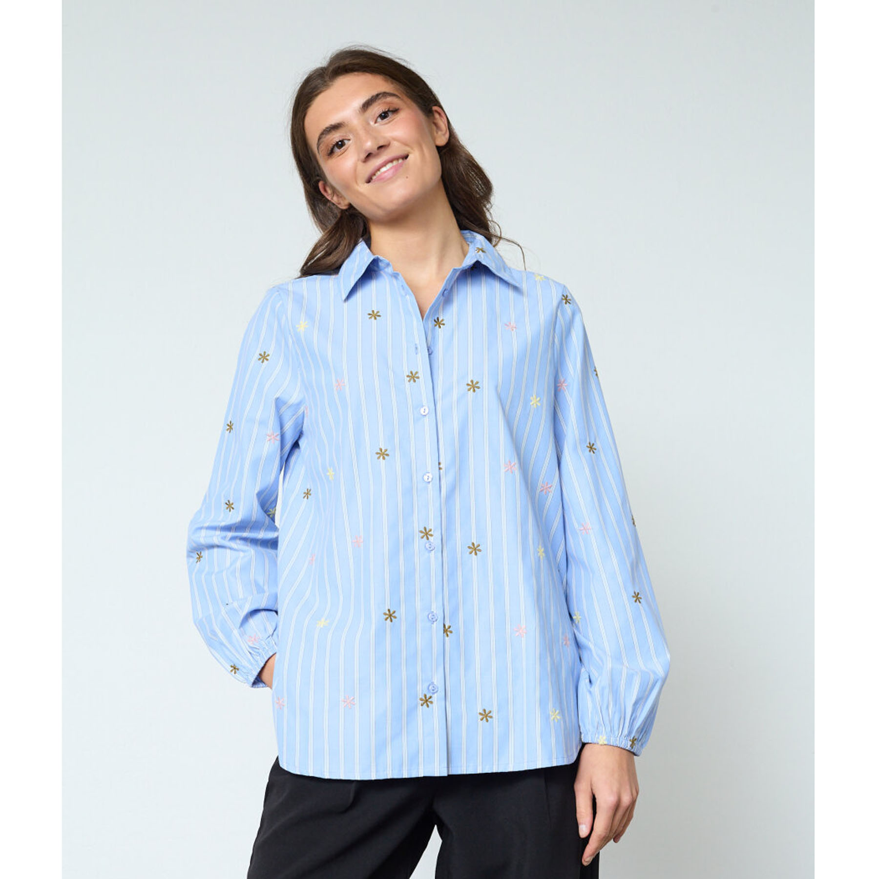 Opdag den stilfulde SISTERS POINT - ISTEA-SH6 | SKJORTE 834 BLUE STRIPES, der er perfekt til den moderne kvinde, der ønsker at kombinere komfort med elegance. Denne skjorte, der hører til kategorien dametoppe, præsenterer et smukt stribet mønster med små broderede stjernemotiver, der tilføjer et unikt præg til dit outfit.