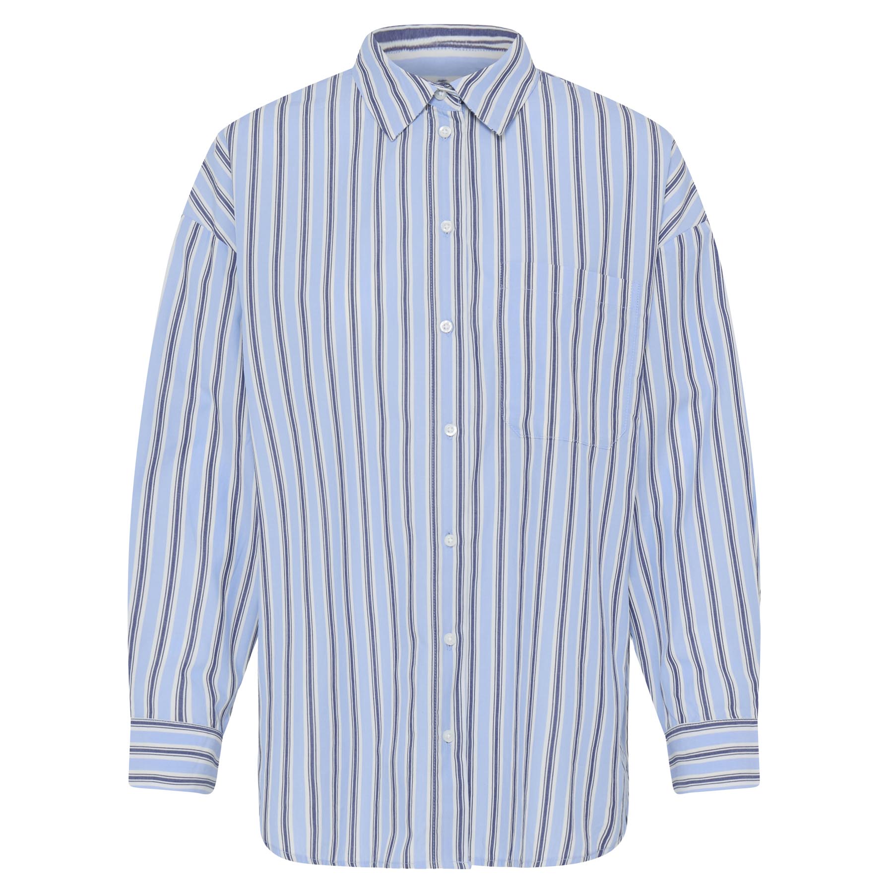 Med sin løse pasform og hip længde tilføjer denne langærmede skorte et afslappet, men stilfuldt præg til din garderobe. Den fås i størrelserne 34, 36, 38, 40 og 42, så du kan finde den perfekte pasform til din kropstype. Blå striber giver et friskt og moderne udtryk, der nemt kan styles med jeans, leggings eller en nederdel.