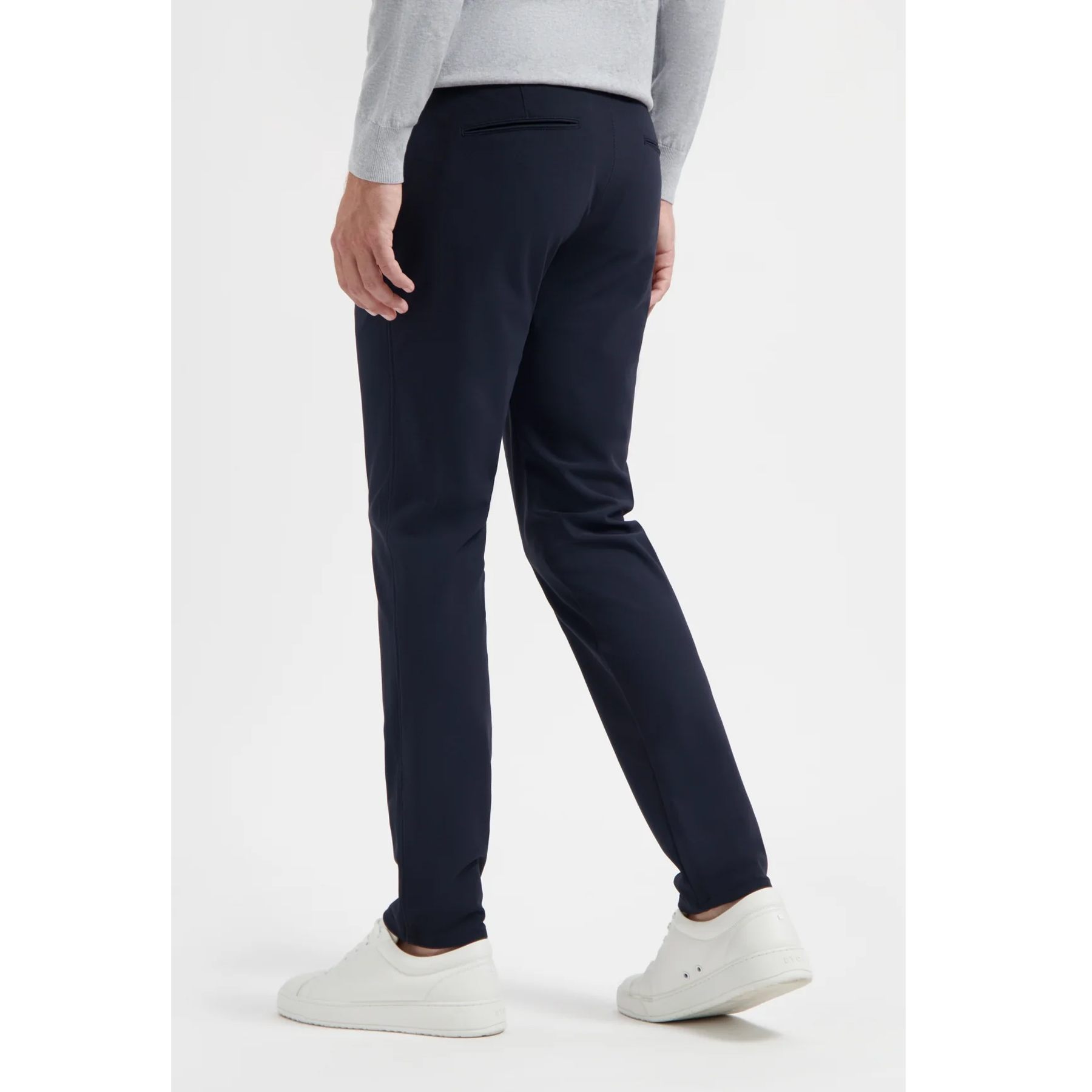 Oplev de perfekte kombination af stil og komfort med North 84 - Travel Pants Bonded. Disse bukser, der kommer i en elegant mørk navy farve (412 DARK NAVY), er designet til den moderne mand, der værdsætter både funktionalitet og udseende. Fremstillet af det innovative Sensitive® Fabrics fra Eurojersey i Italien, tilbyder disse bukser en bonded kvalitet, hvilket betyder, at de består af to lag stof, der er subtilt sammenføjet. Udenpå har bukserne en raffineret struktur, mens indersiden er blød og behagelig mod huden.